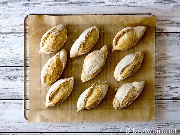 - Baguette Brötchen backen: Brötchen in den Ofen einschießen. Mit Dampf 18 – 20 Minuten bei gleichbleibender Temperatur backen.