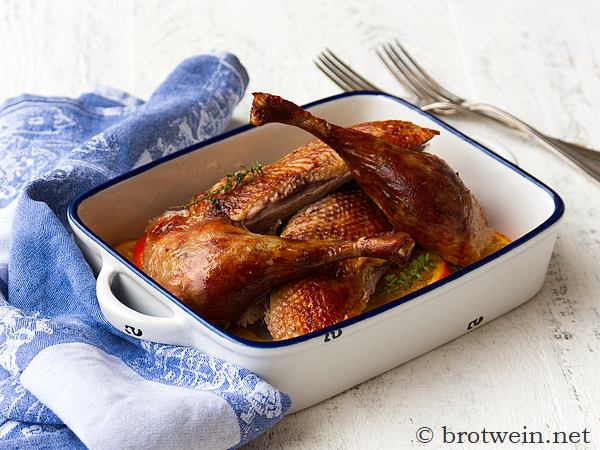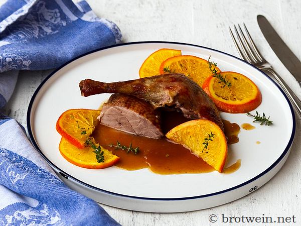 Für Ente á l’orange wird die Ente klassisch im Backofen gebraten. Zuerst mit der Brust nach oben, dann mit dem Rücken nach oben und zum Schluss mit hoher Hitze ohne Grill noch einmal mit Brust nach oben. Dadurch gart auch die Brust durch und kann nicht vorher verbrennen. Wichtig ist das regelmäßige übergießen mit Salzwasser bzw. Fond.