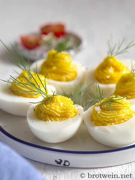 - Eigelb, Senf und Mayonnaise mit dem Pürierstab zu einer feinen Masse mixen. Mit Salz abschmecken. Die Masse in einen Spritzbeutel geben und die Füllung in die Eihälften einspritzen. Auf eine Servierplatte geben und mit Kräuter der Wahl garnieren.