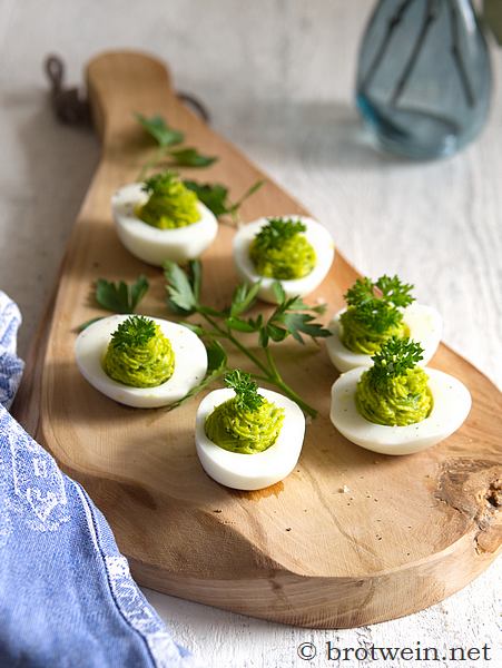- Eigelb, gehackte Kräuter und Mayonnaise mit dem Pürierstab zu einer feinen Masse mixen. Mit Salz abschmecken. Die Masse in einen Spritzbeutel geben und die Füllung in die Eihälften einspritzen. Auf eine Servierplatte geben und mit den verwendeten Kräuterzutat (z.B. Petersilie, Bärlauch, Estagon) garnieren.