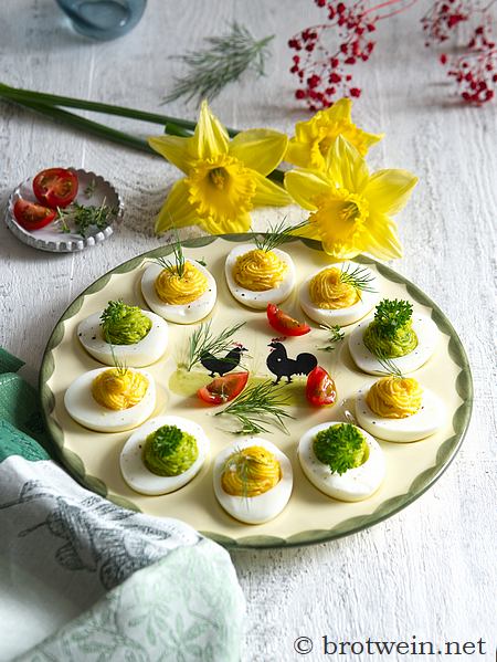 Zu Ostern gibt es eine ganze Reihe Gerichte aus aller Welt, die problemlos selber machbar sind. Das beste Beispiel sind bunt gefärbte Eier und Eiersalate, die es nun überall in der Kühltheke gibt. Auch verschiedene jahreszeitlich angepasste Cremes und Dips, z.B. Bärlauch- und Tomaten, gibt es reichlich. Als Kombination daraus zeige ich wie mit wenigen Zutaten köstliche gefüllte Eier entstehen.