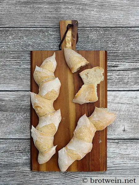 Zubereitungszeit insgesamt: ca. 36 bis 50 Stunden Mit Maschine geknetet. Quelle: Modifiziert nach Baguette mit langer kalter Gare