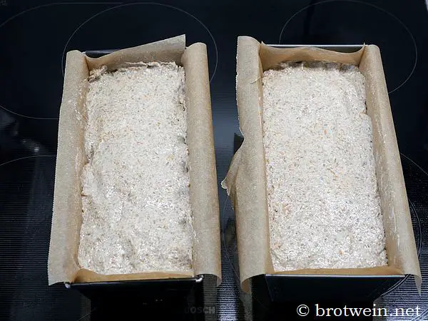 - Teilen und Formen: Den Teig noch einmal kurz durchmischen, dann mit nassen Händen in die gefettete oder mit Backpapier ausgelegte Kastenform legen. (Teig ca. 1 cm unter dem Rand.) Optional mit Getreideflocken bestreuen.