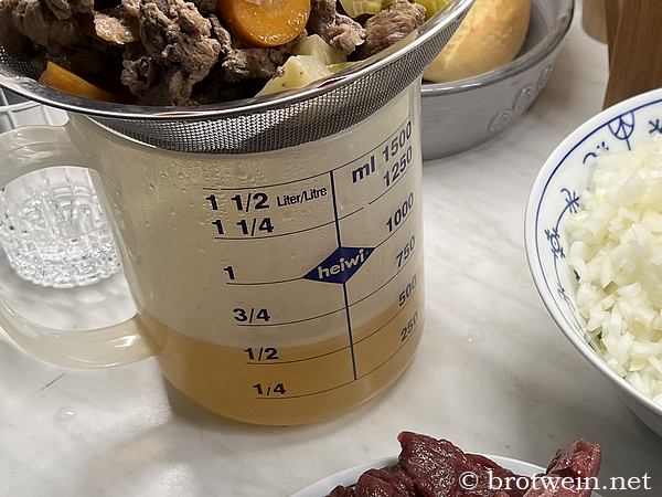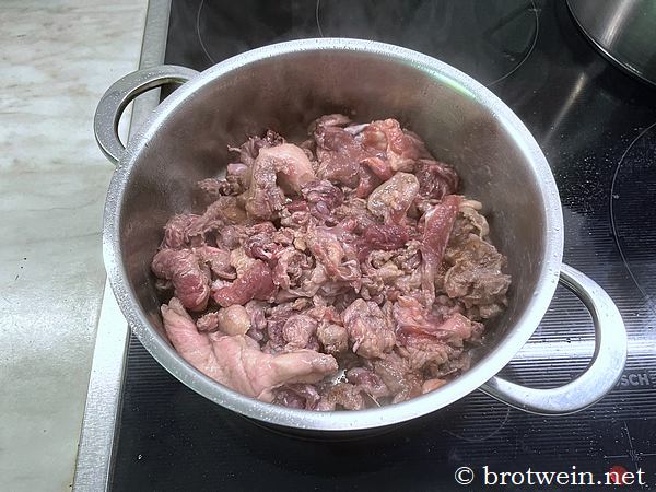 Also unbedingt früh genug anfangen und die längstmögliche Zeit einplanen. Oder noch besser: schon am Vortag Fond und Gulasch kochen. Warmhalten oder aufwärmen geht immer. Aber nichts ist unangenehmer, als wenn die Verwandschaft hungrig noch zwei Stunden warten muss, weil es noch braucht. Denn zu festes Fleisch zu servieren wäre zu Schade für dieses Festessen!