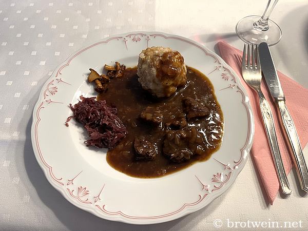 Das klassische Wildschweingulasch mit Rotwein ist ein ganu besonderes Sonntags- und Feiertagsessen. Als Beilagen gab es Semmelknödel und Apfel-Rotkohl. Das Wildgulaschfleisch wurde aus der Keule geschnitten. Einfach etwas ganz besonderes!