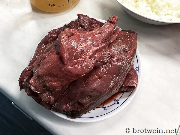 Zu einem guten Schmorgericht gehört ein guter Fond – Wildfond oder eine andere gute Fleischbrühe. Ebenso die üppige Menge an Zwiebeln in Gulasch – also mindestens die Hälfte an Fleischgewicht, besser noch die gleiche Menge an Zwiebeln wie Fleisch. Diese werden natürlich auch – wie das Fleisch – portionsweise angebraten. Das ist einiges an Arbeit, aber die lohnt sich! Das gibt der Sauce erst die richtigen Röstaromen und Tiefe. Ebenso ergeben die vielen Zwiebeln eine gewisse Grundsämigkeit. Auch am Wein sollte man nicht sparen. Das muss kein Spitzenwein sein, aber er soll durchaus auch so gut trinkbar sein. Wer keinen Wein nehmen möchte, der sollte ihn durch guten Fond ersetzen.